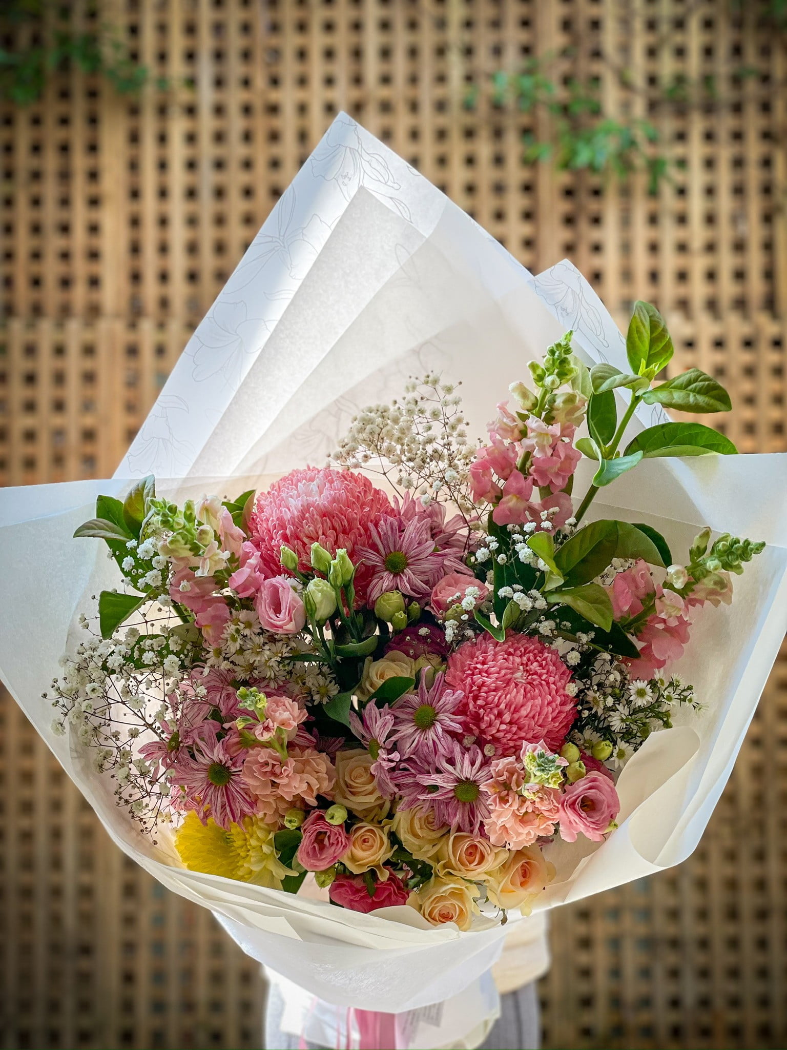 Deluxe bouquet size featured, supplied to you gift wrapped (in environmentally-friendly paper, naturally). Option for vase available. Please refer to our glassware for more details.